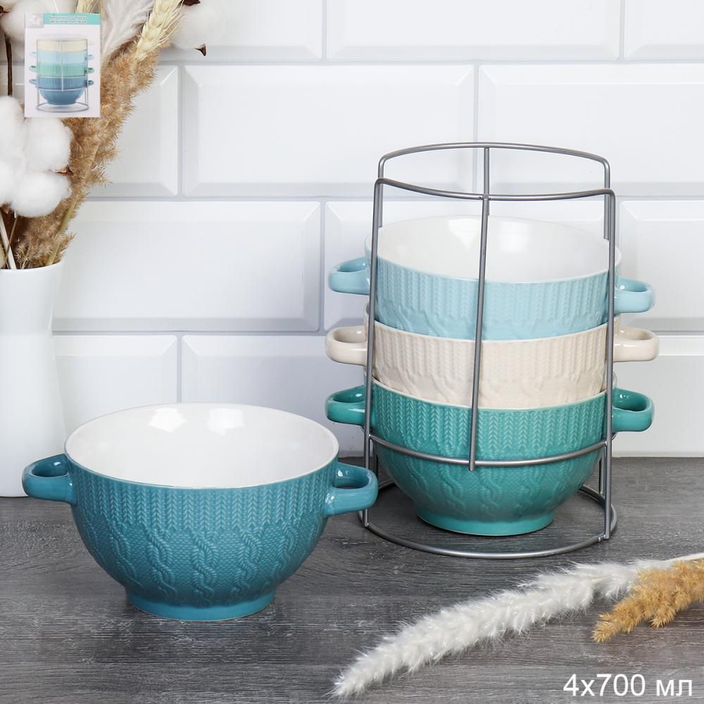 Набор супниц с ручками 4шт 700мл "Морская волна" на подставке